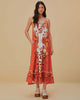 model wearing red, orange and white print maxi dress with ric rac detail and rope straps