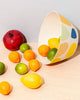 cream bowl with colorful pebble design with fruit spilling out