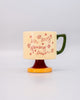 cream short ceramic mug with pink cursive 'in my growing season' with green handle and pink and yellow pedestal  on a table filled with coffee