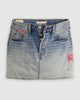 up close of patches on medium sand wash mini skirt