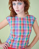 Introducing the Madeline Top. This vintage inspired top is perfect for all occasions. With Lisa Says Gah's signature colorburst plaid pattern, classic silhouette, and button up detail, it adds the perfect element to any outfit. Complete the set with their Penny Skirt in Colorburst!
