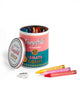 packaged tin andy warhol campbell soup can with colorful crayons and sharpener