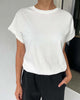 Ease Tee is an edgy dolman tee. She features a high crew neck, shoulder coverage without a sleeve, slightly rounded hem and a contrast rib banded sleeve opening and neck opening. With a crisp color palette and enough length to tuck in or out she is a cool girl's uniform.