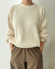 side view of model wearing cream colored waffle sweatshirt with slight balloon sleeves