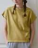 model wearing mustard yellow tee with ringer neckline and muscle tee sleeves