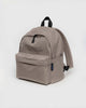 taupe medium nylon backpack with large zipper compartment, front zipper pocket, and side drink holder