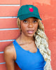 model holding green dad hat with red tomato design