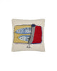 cream square throw pillow with two sardines in a red tin on a chair